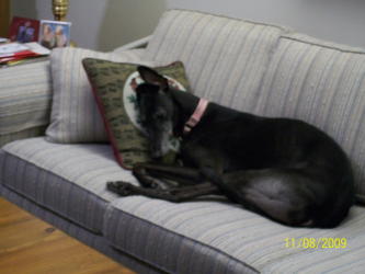 their dog Chelsea (Greyhound rescue dog-retired after racing) - amazing,